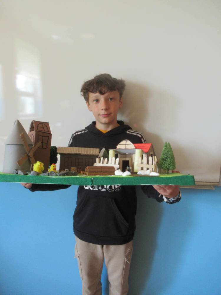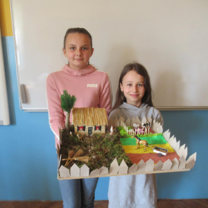 W ramach lekcji historii uczniowie klasy V: Zuzanna Kowalska, Lena Ryszczyk i Emil Nicpoń wykonali makiety, na których znalazły się elementy charakterystyczne dla średniowiecznej wsi.