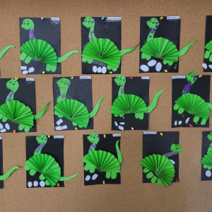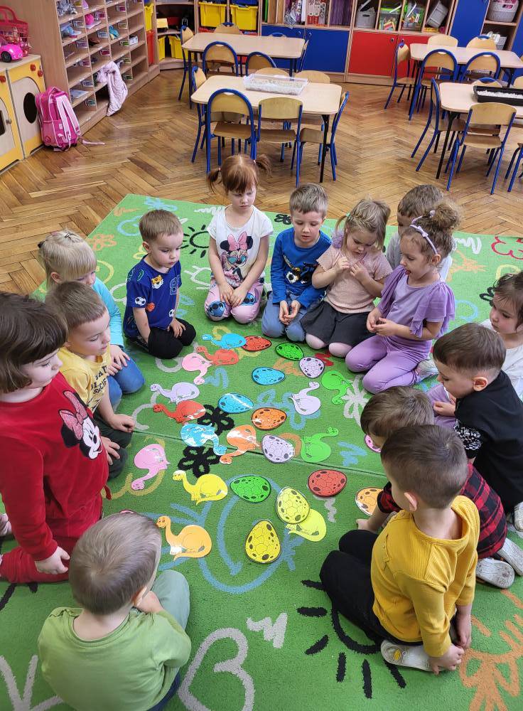 W dinozaurach jest coś magicznego i wyjątkowego, coś, co przyciąga i interesuje dzieci. W minionym tygodniu Maluszki przeniosły się w czasy prehistoryczne, kiedy to na Ziemi królowały dinozaury. Mali odkrywcy mogli poznać życie tych fascynujących gadów, segregowali dinozaury według kolorów, szukali skamielin w piasku, przeliczali dinozaury, łączyli jajko z dinozaurami według koloru, odciskali stropy dinozaurów w plastelinie, ułożyli szkielet dinozaura, ćwiczyli orientacje w przestrzeni, wykonali prace plastyczne Zajęcia były również okazją do pochwalenia się swoimi zbiorami dinozaurów, które dzieci przynosiły do przedszkola.