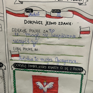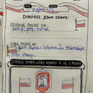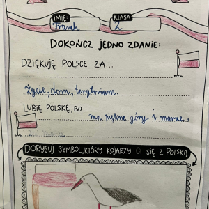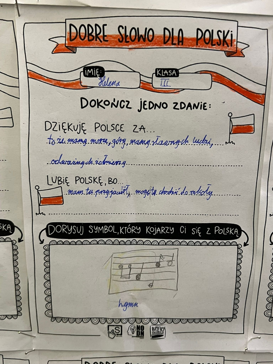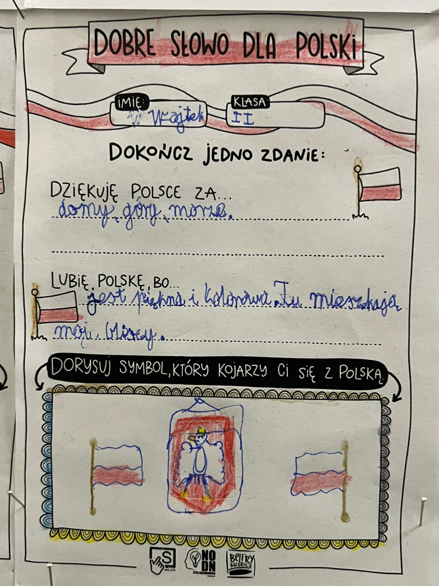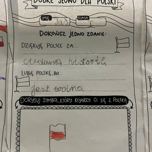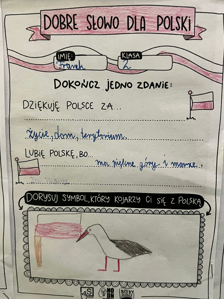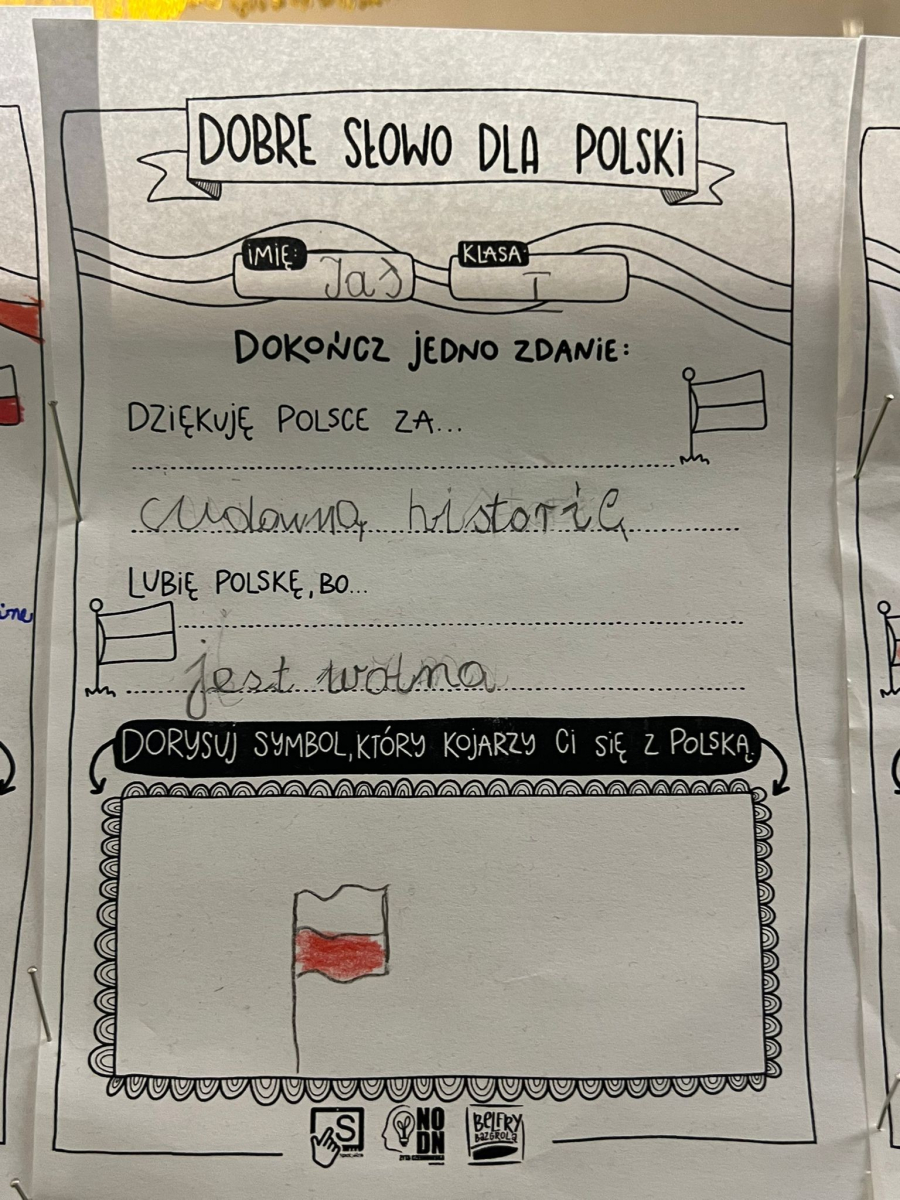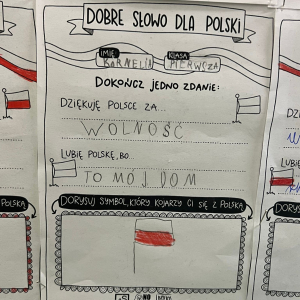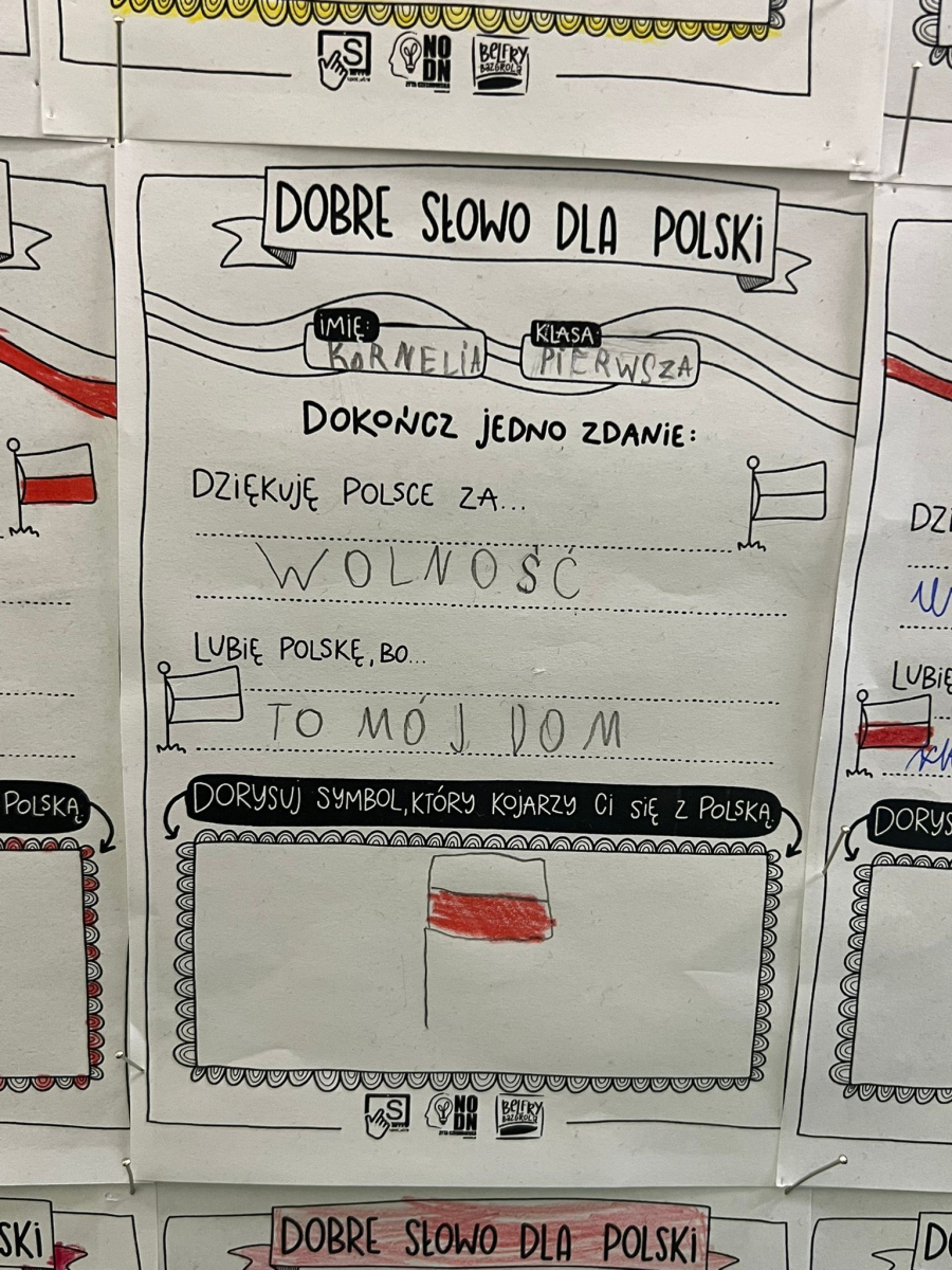 W dniach poprzedzających 11 listopada klasy I-III wzięły udział w akcji "Dobre słowo dla Polski". Jej celem było wzmacnianie postawy wdzięczności, wspólnoty i refleksji nad tym, co kochamy w naszym kraju. Zamiast patosu i wzniosłych haseł ważne były autentyczne emocje, osobiste skojarzenia i małe gesty życzliwości wobec Ojczyzny. To okazja, by pokazać, że patriotyzm może mieć codzienny, ciepły i serdeczny wymiar. W szkole, przy wejściu można podziwiać "ścianę wdzięczności" z dobrymi słowami dla Polski.
