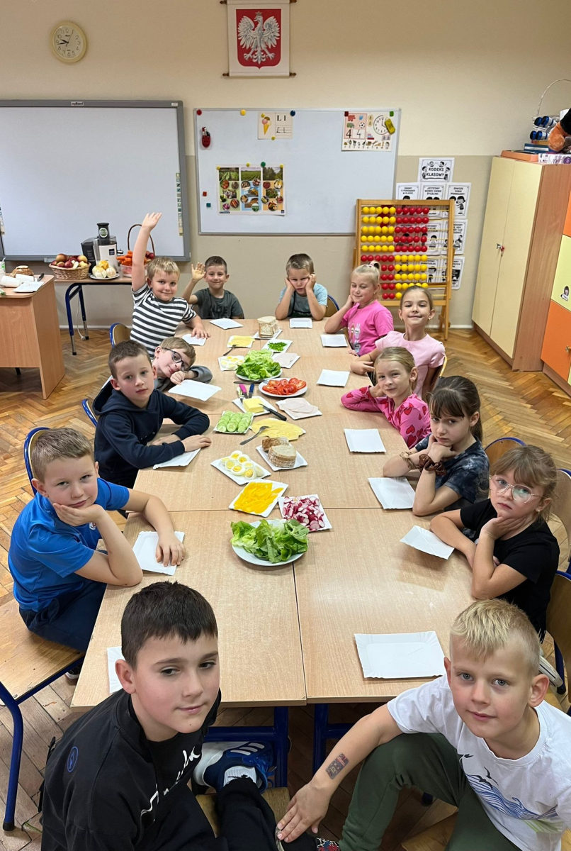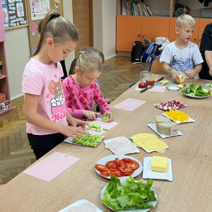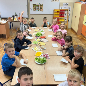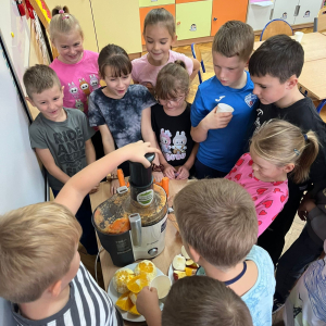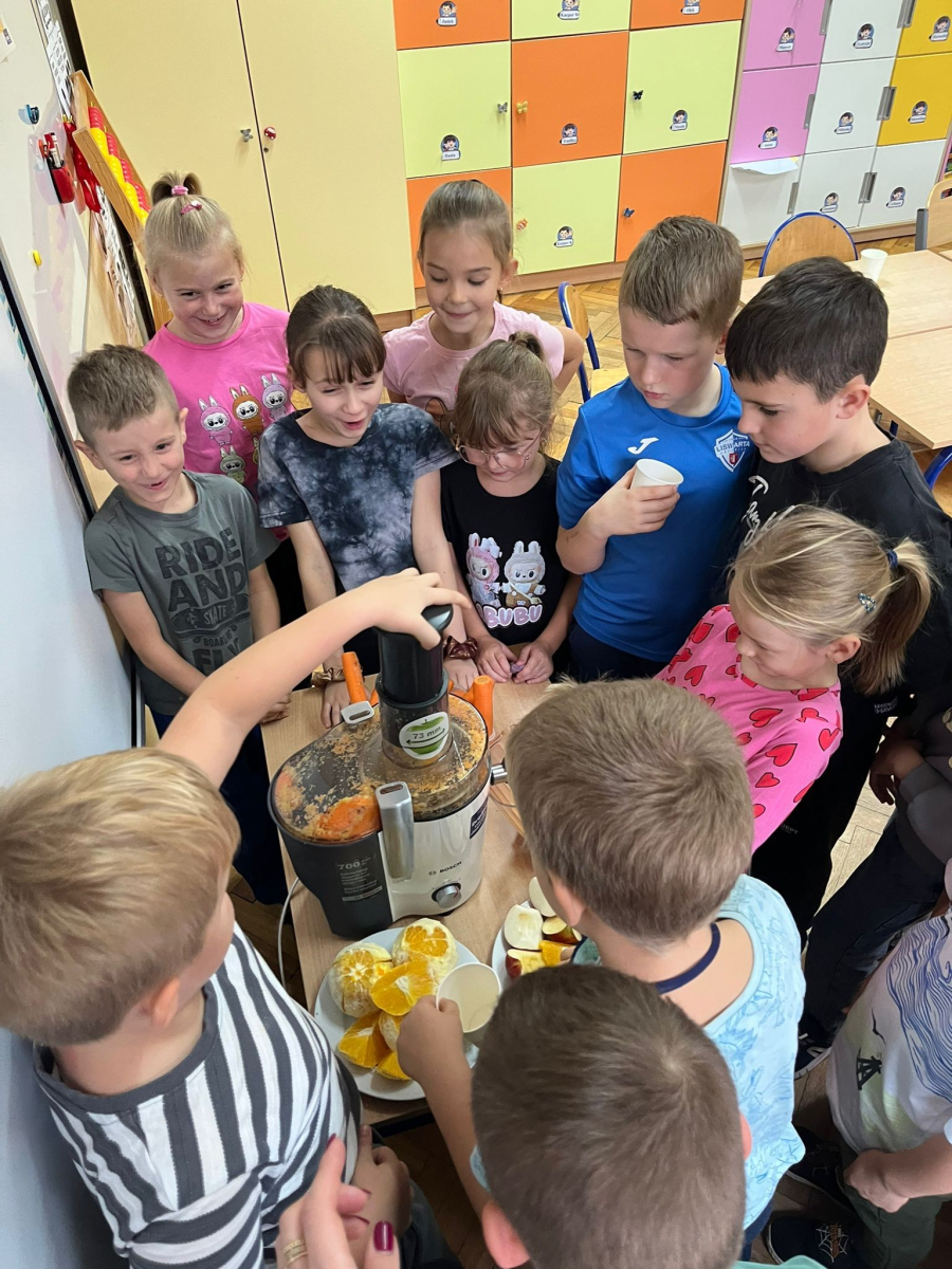 W tym tygodniu uczniowie klasy pierwszej poznawali zasady zdrowego odżywiania oraz rozmawiali o znaczeniu właściwych nawyków żywieniowych. W ramach zajęć praktycznych dzieci samodzielnie przygotowały zdrowe drugie śniadanie, a następnie wycisnęły pyszny, świeży sok z jabłek, marchewek i pomarańczy.