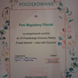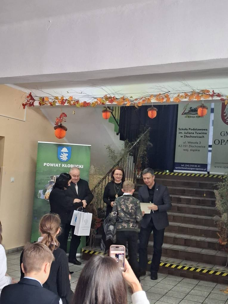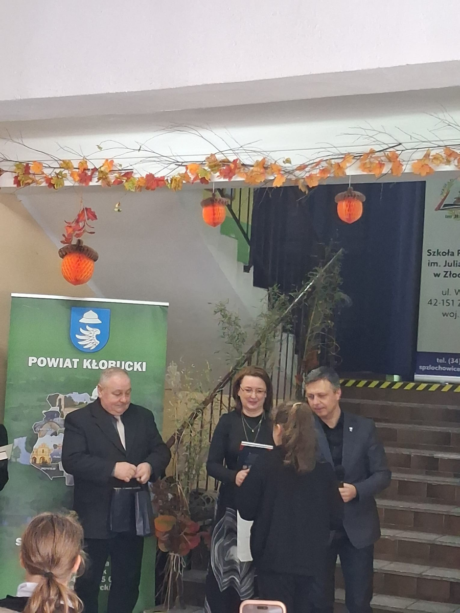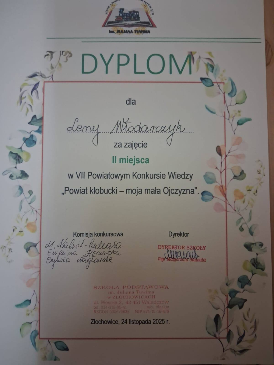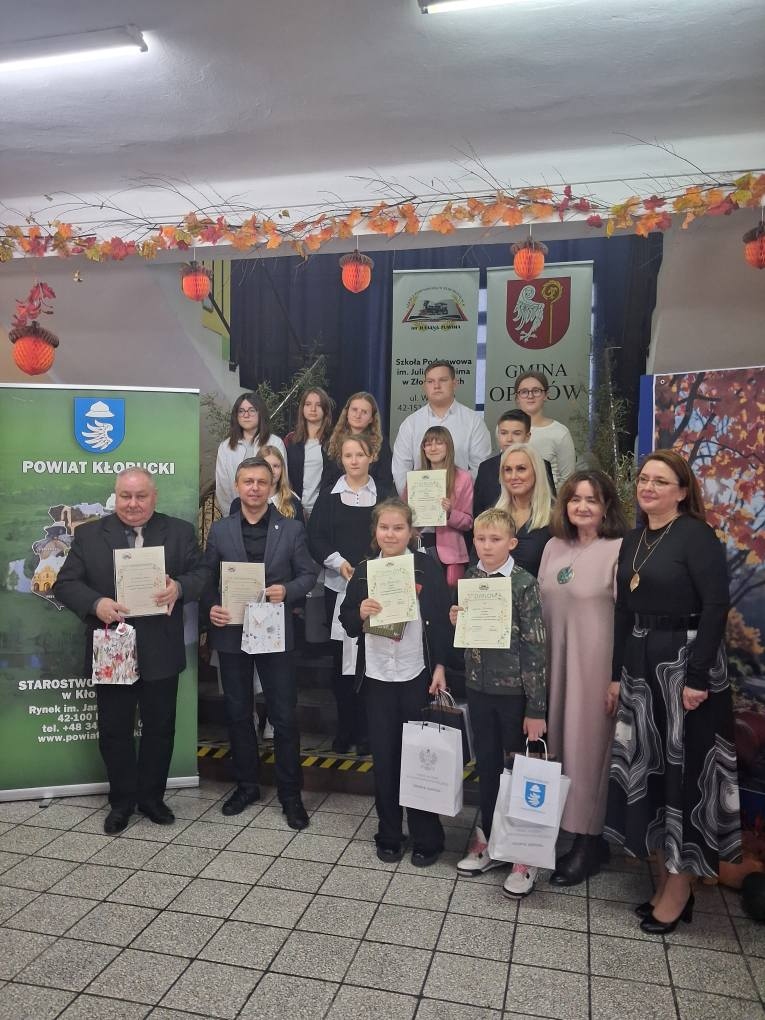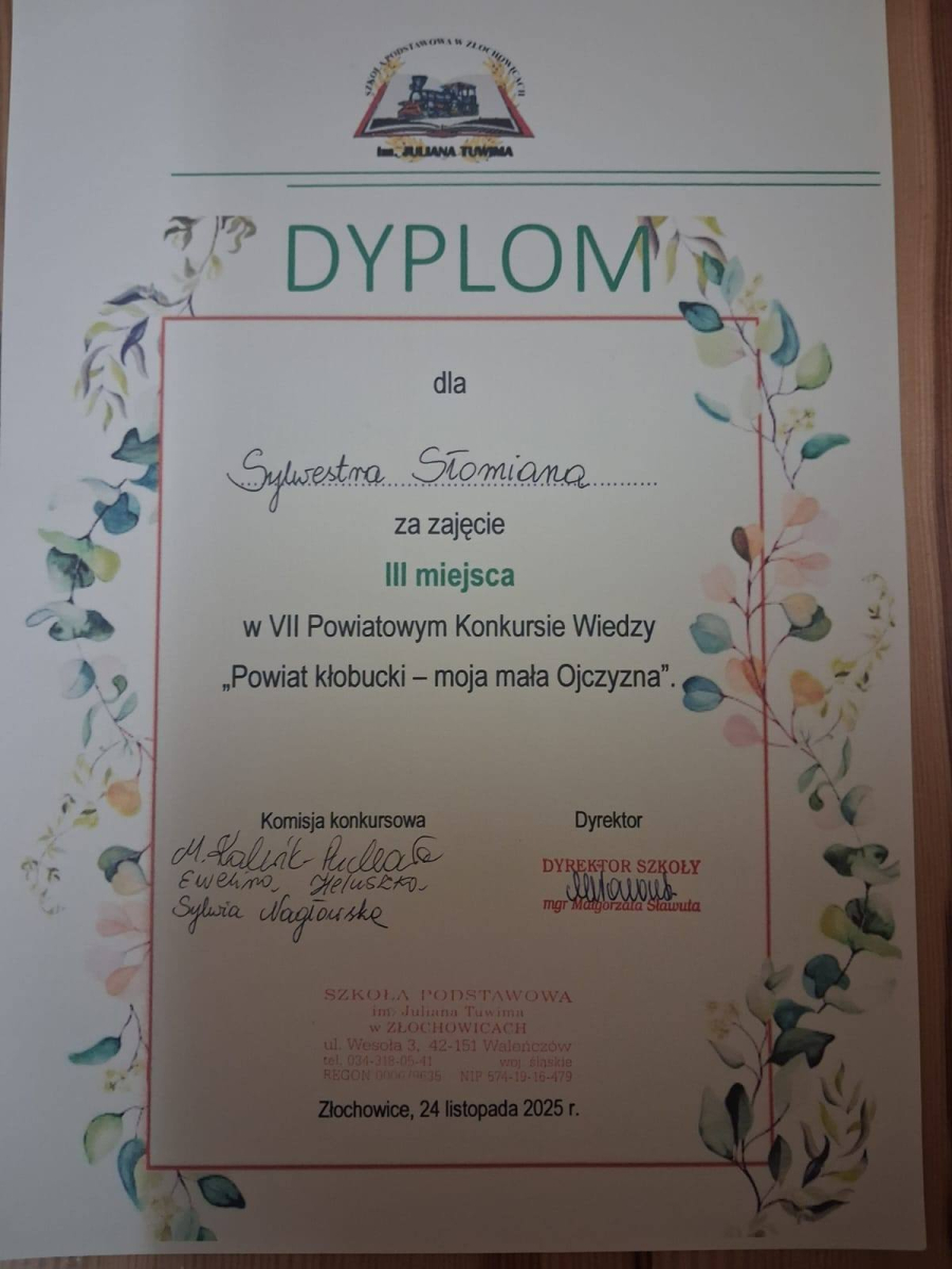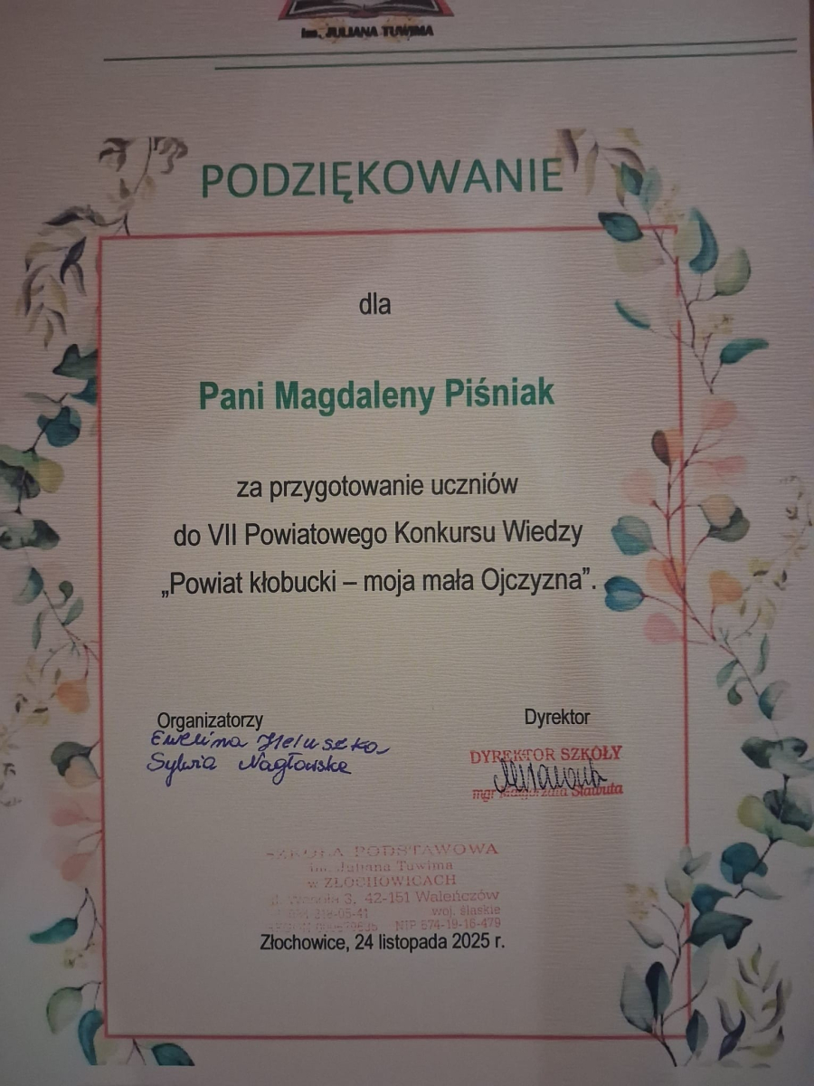 24 listopada 2025r. w Szkole Podstawowej im. Juliana Tuwima w Złochowicach odbył się VII POWIATOWY KONKURS WIEDZY „Powiat kłobucki – moja mała Ojczyzna” WYBITNI MIESZKAŃCY ZIEMI KŁOBUCKIEJ pod honorowym patronatem Starosty Kłobuckiego. Celem konkursu było kształtowanie postaw obywatelskich, upowszechnianie wiedzy o powiecie kłobuckim, wzmacnianie patriotyzmu lokalnego, kształtowanie umiejętności samodzielnego zdobywania wiedzy, integracja szkół w powiecie i współzawodnictwo między uczniami różnych szkół. Zadaniem uczestników konkursu było rozwiązanie testu składającego się z 60 zamkniętych pytań dotyczących znajomości życia i twórczości wybitnych mieszkańców ziemi kłobuckiej: Jana Długosza, Władysława Sebyły, Mikołaja z Wilkowiecka. W konkursie uczestniczyli uczniowie z 8 szkół podstawowych z terenu powiatu kłobuckiego z klas V- VIII.