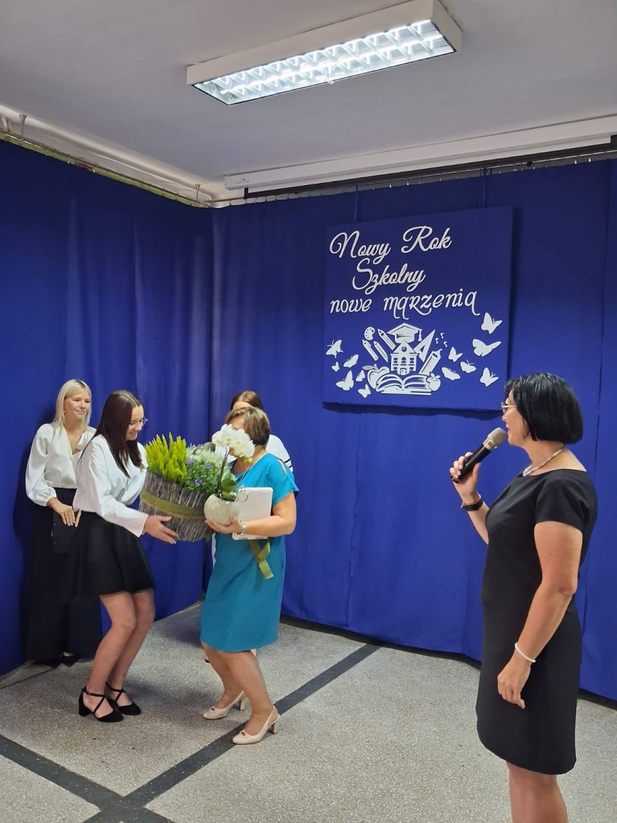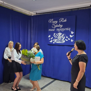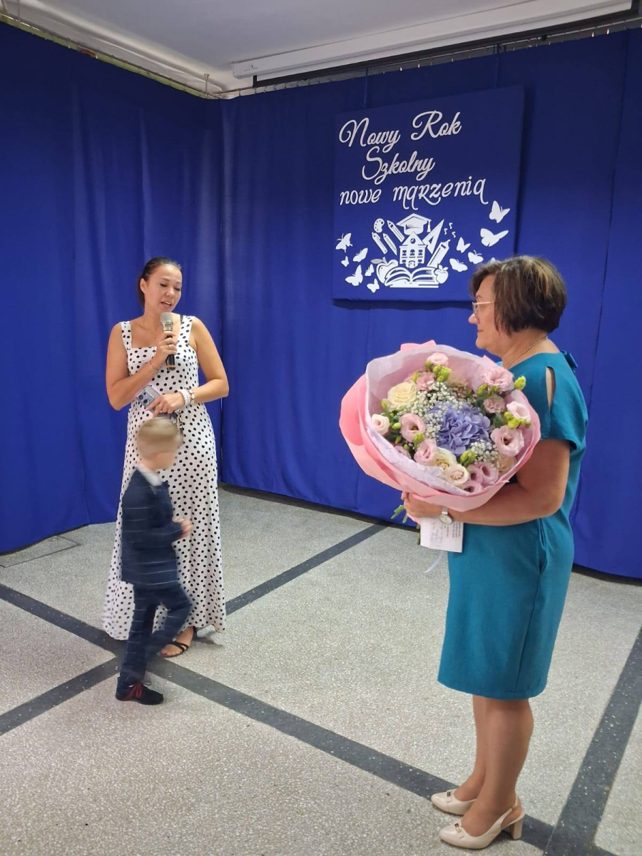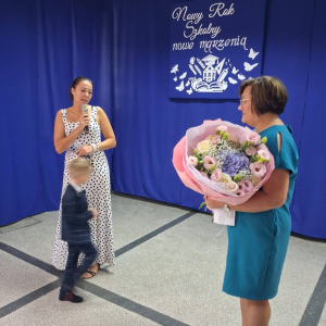 Tego dnia również pożegnaliśmy Panią Annę Grzelińską – nauczyciela kształcenia zintegrowanego, która po 40 latach pracy w naszej szkole przeszła na zasłużoną emeryturę. Pożegnania są najtrudniejsze, bo jak rozstać się i podziękować osobie, z którą przebyło się tyle dróg, wydeptało tyle ścieżek… choć wiemy, że wszystko zawsze ma swój kres, praca nie trwa wiecznie, to i tak nie jest łatwo… Dyrektor szkoły podziękowała za współpracę dydaktyczno-wychowawczą na rzecz uczniów, nieoceniony wkład w rozwój szkoły oraz współtworzenie atmosfery wzajemnego szacunku i życzliwości. Pani Ania podziękowała za współpracę nauczycielom, dyrekcji szkoły i rodzicom, podkreślając, że będzie pamiętać o wszystkich wspaniałych chwilach spędzonych wśród dzieci, życzliwych i pomocnych rodzicach oraz kolegach i koleżankach nauczycieli. Emerytura to również nowy początek, dlatego życzymy Pani Ani, aby nowy rozdział życia okazał się idealnym momentem na zwolnienie tempa życia, odpoczynek, relaks, aby w pełnym zdrowiu mogła korzystać z piękna świata, spędzać czas z bliskimi, rodziną przyjaciółmi.
