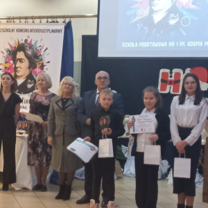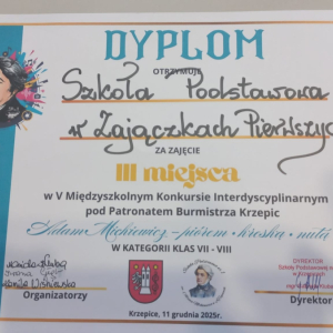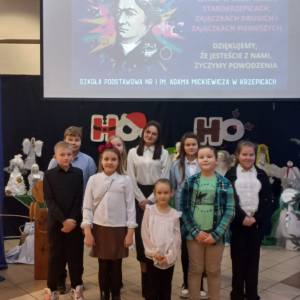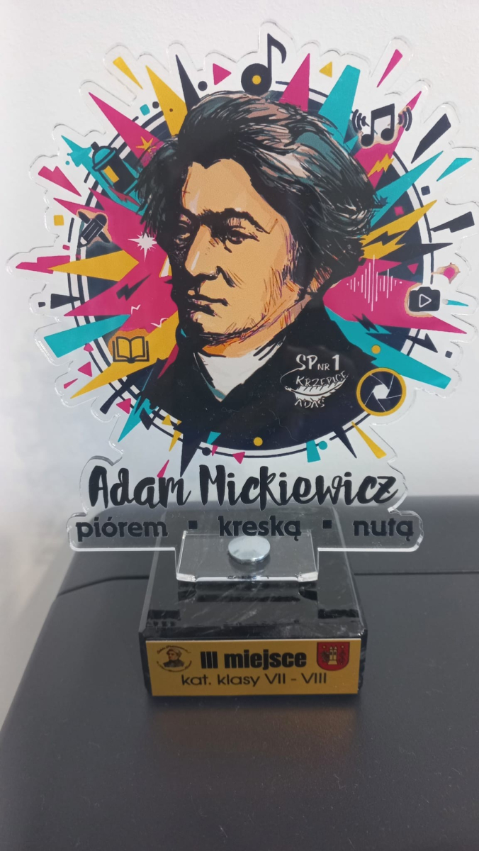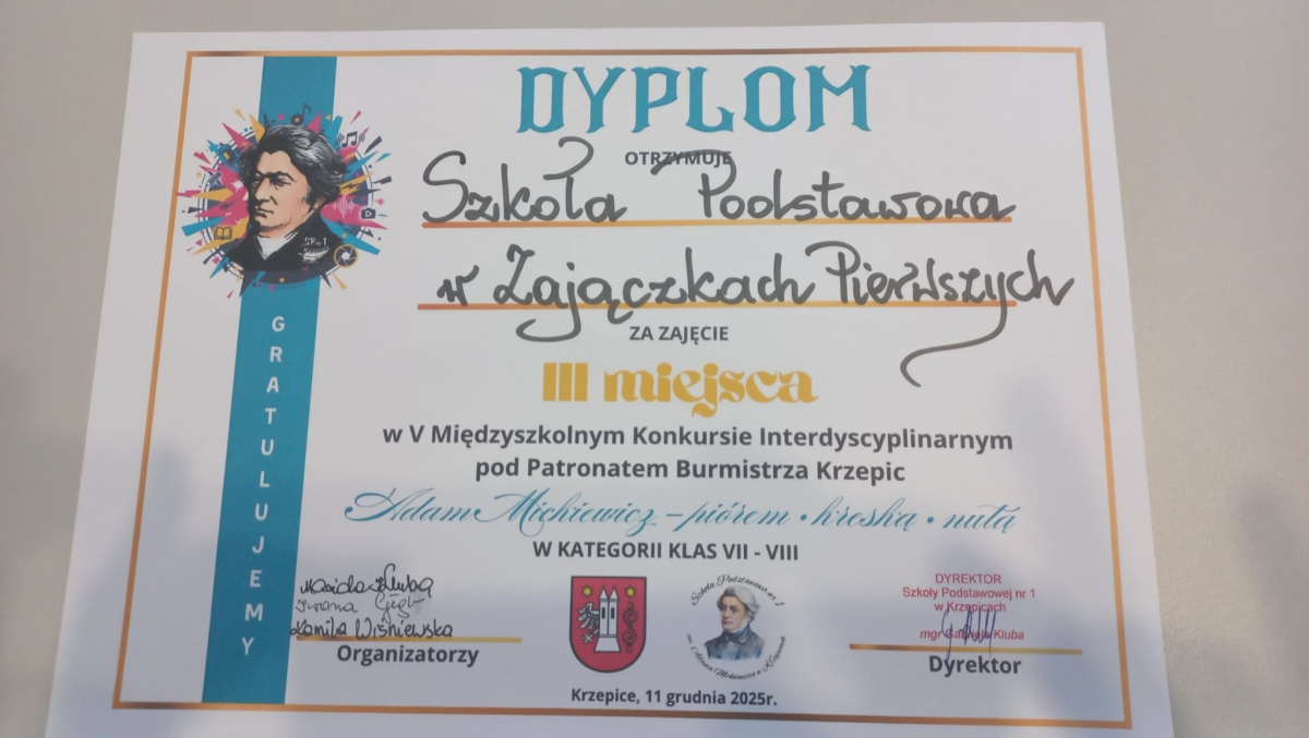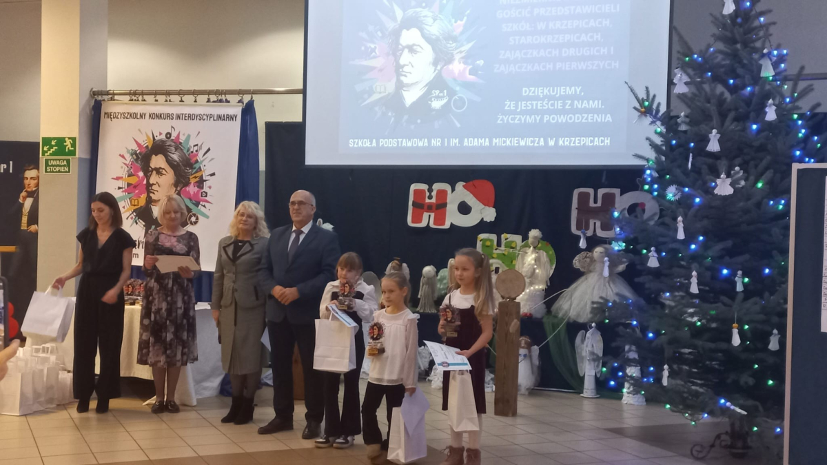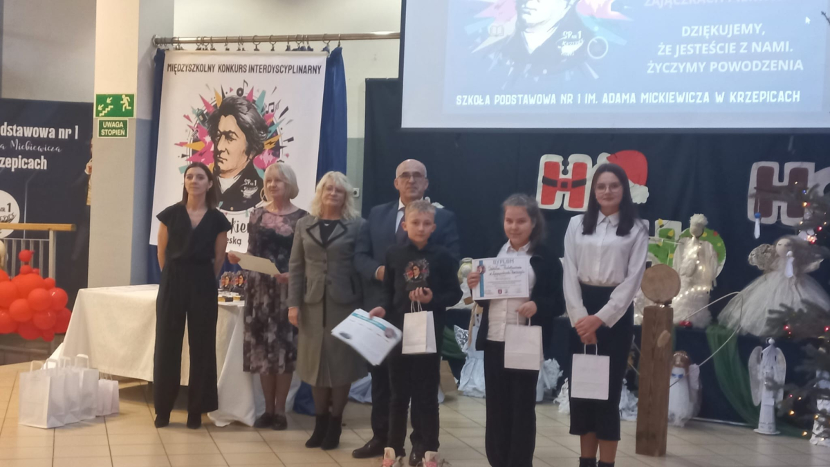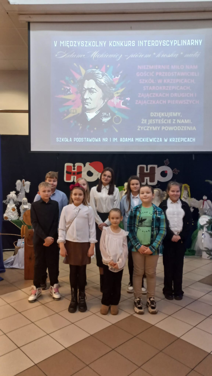 11 grudnia 2025r. W Szkole Podstawowej nr 1 w Krzepicach odbył się V Międzyszkolny Konkurs Interdyscyplinarny "Adam Mickiewicz Piórem-Kres ką-Nutą". Konkurs był realizowany w trzech etapach: