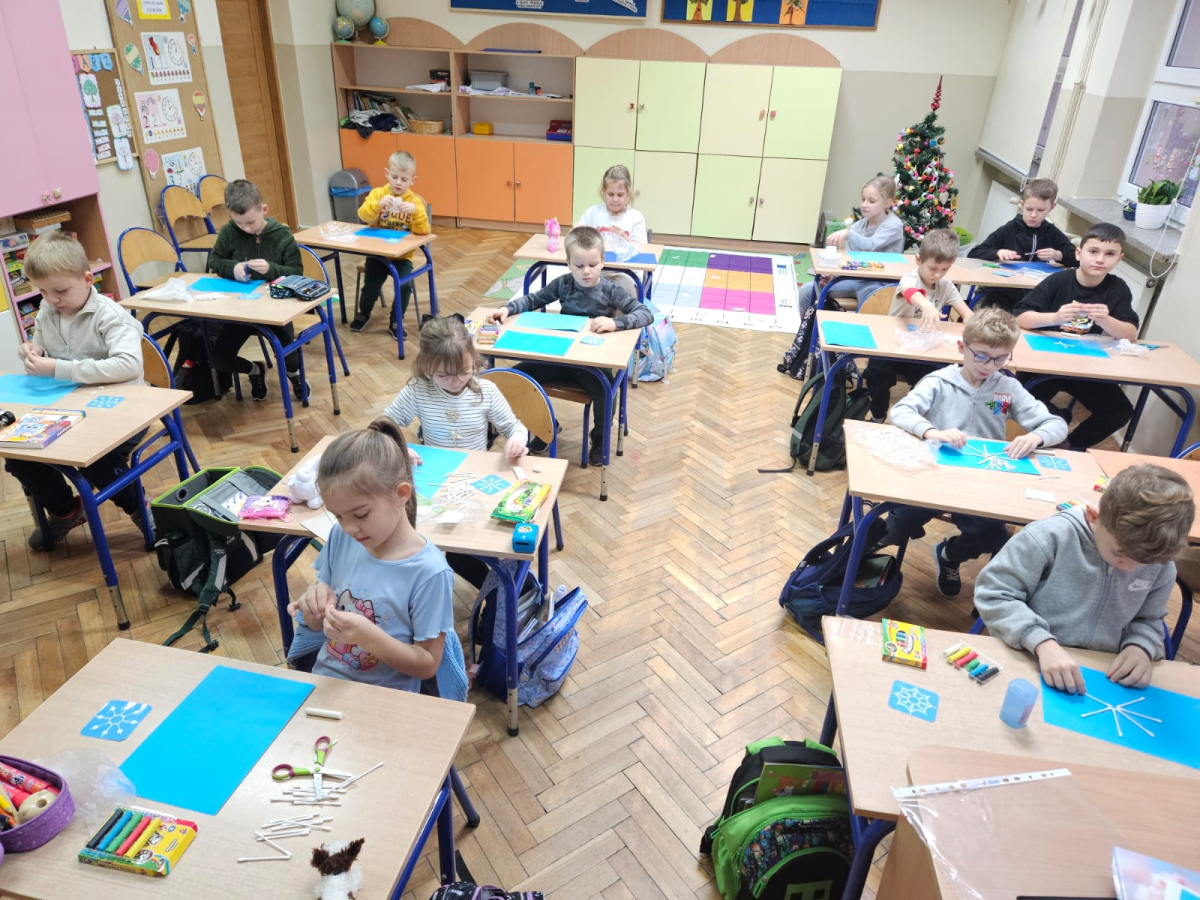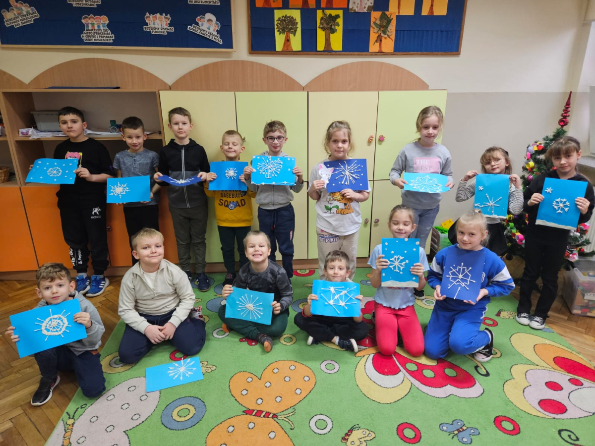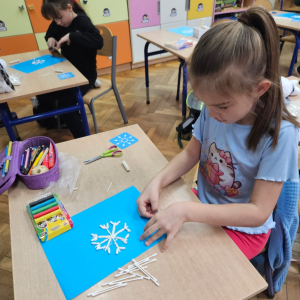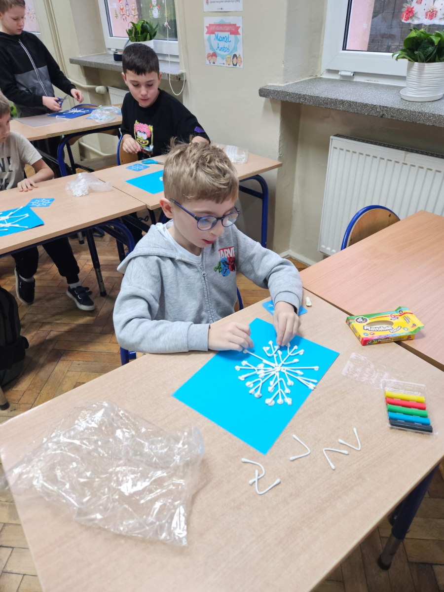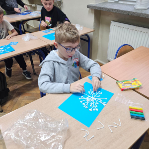 Pierwszoklasiści programowali robota, aby odnaleźć drugą część wylosowanego płatka śniegu oraz tworzyli własne płatki śniegu z plasteliny i patyczków, rozwijając kreatywność i wyobraźnię.
