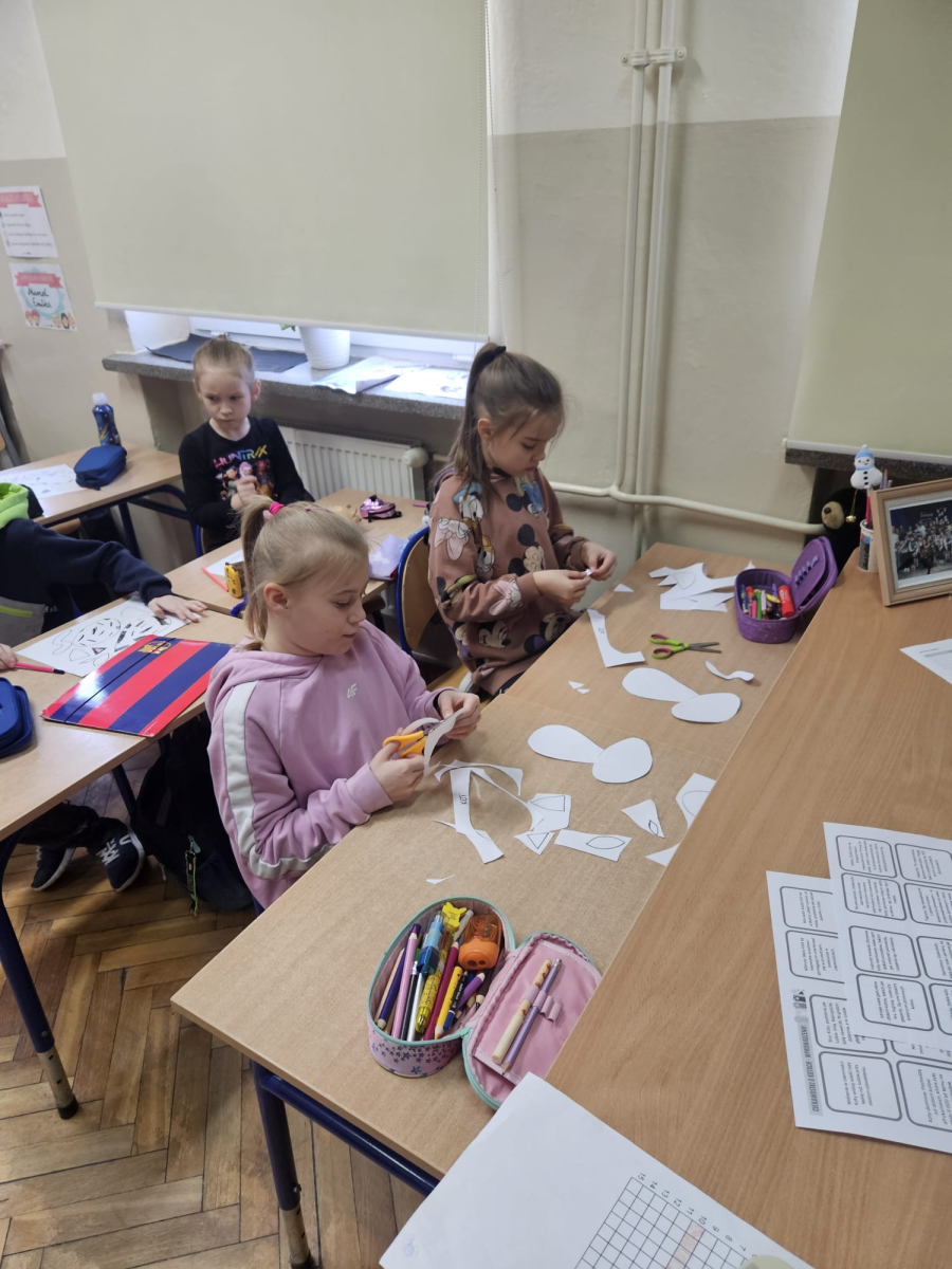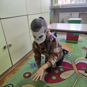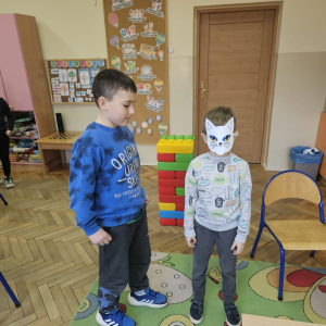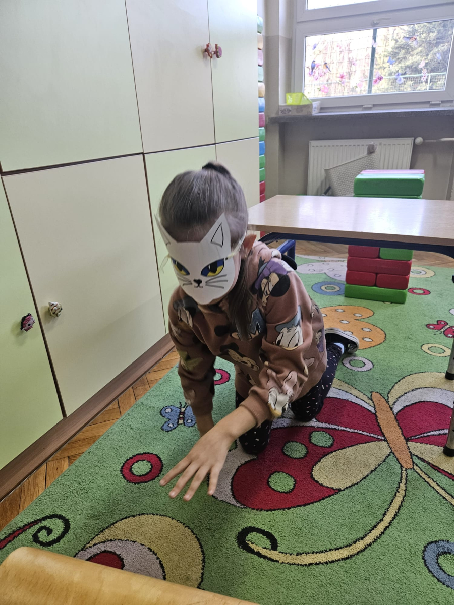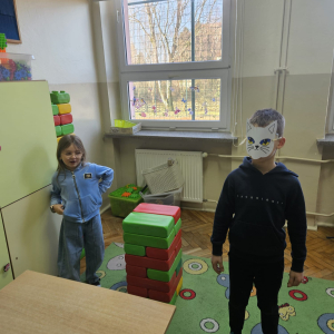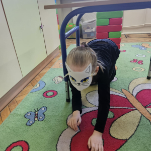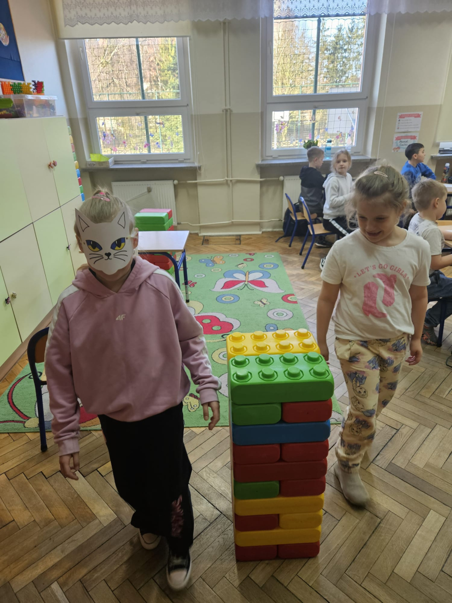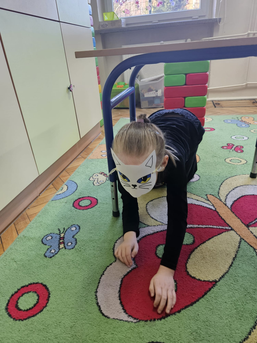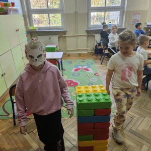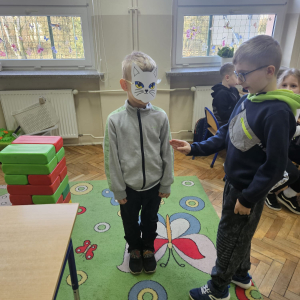 Zadanie było okazją do nauki współpracy i komunikacji. Uczniowie ćwiczyli wydawanie precyzyjnych poleceń koledze lub koleżance, którzy wcielali się w rolę „kotka” i – z założoną maską – pokonywali tor przeszkód. To zadanie pokazało, jak ważna jest jasność przekazu i wzajemne zaufanie.