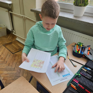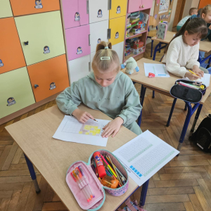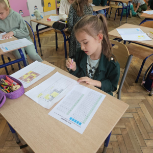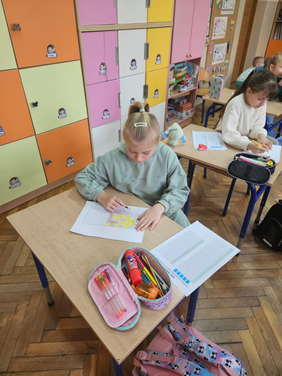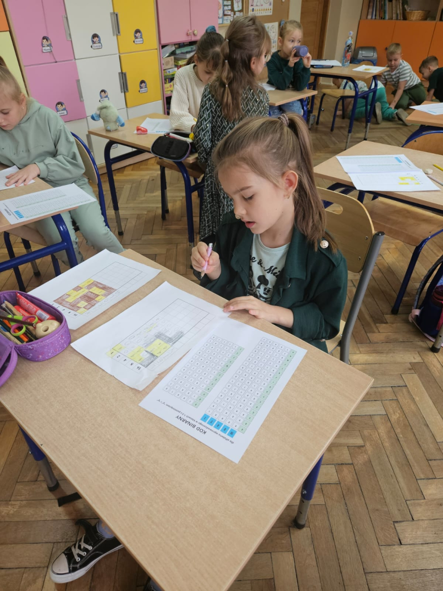 Pierwszoklasiści poznawali kod binarny, kodując i odkodowując swoje imiona oraz wykonywali ćwiczenia buzi i języka, dbając o poprawną wymowę.