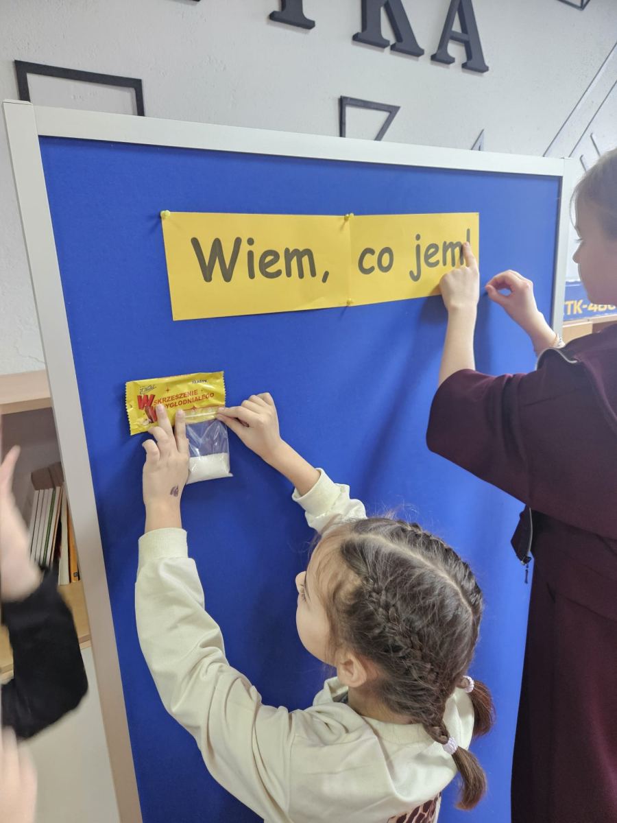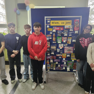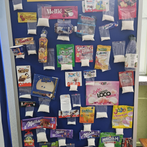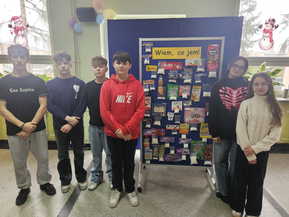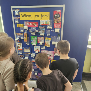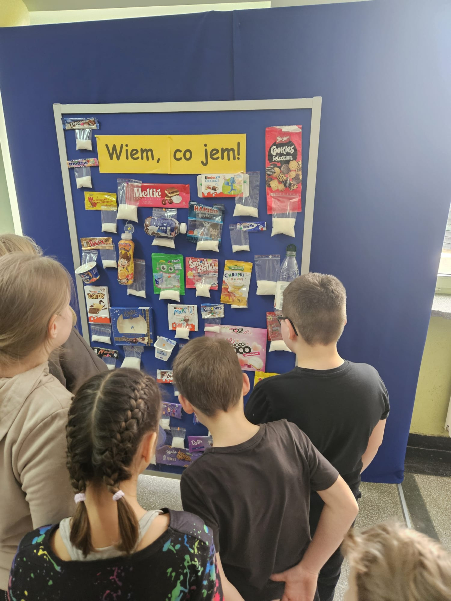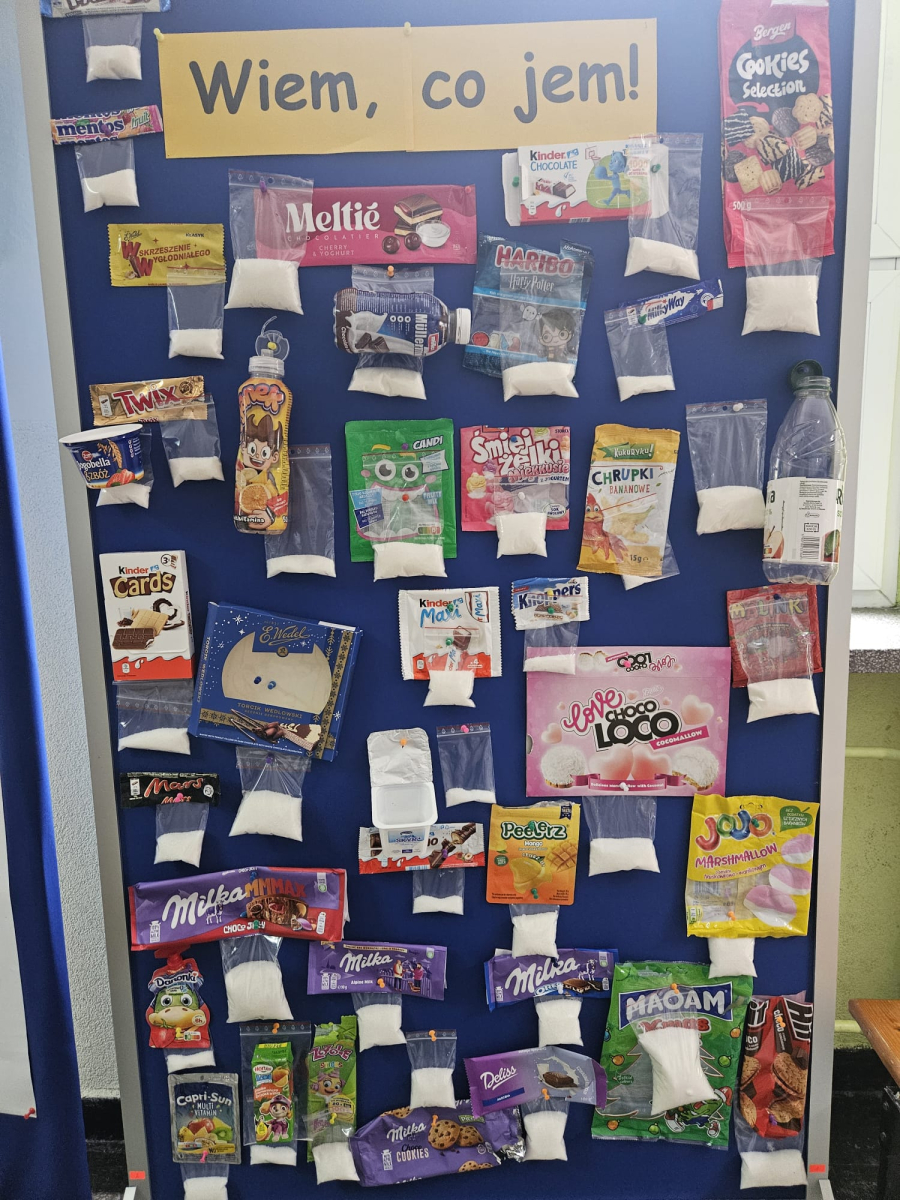 MODUŁ IV - 6. WIEM, CO JEM. Uczniowie klasy IV i VIII przygotowali tablicę przedstawiającą zawartość cukru w spożywanych przez dzieci przekąskach i napojach.