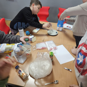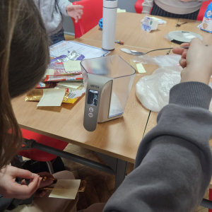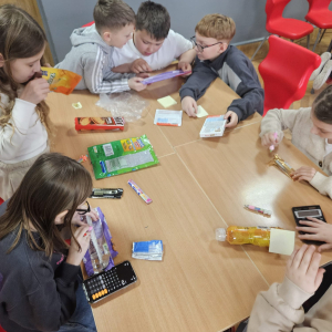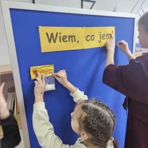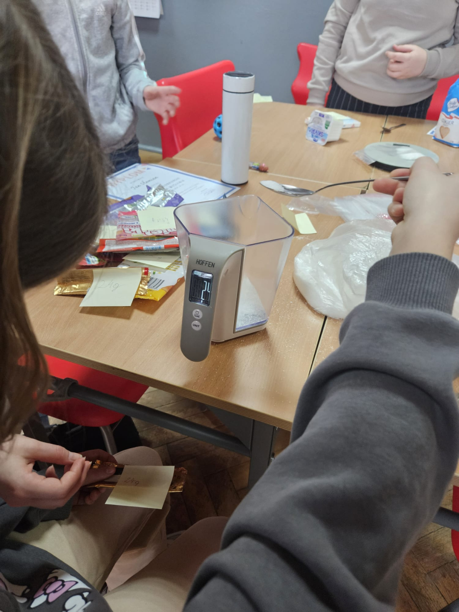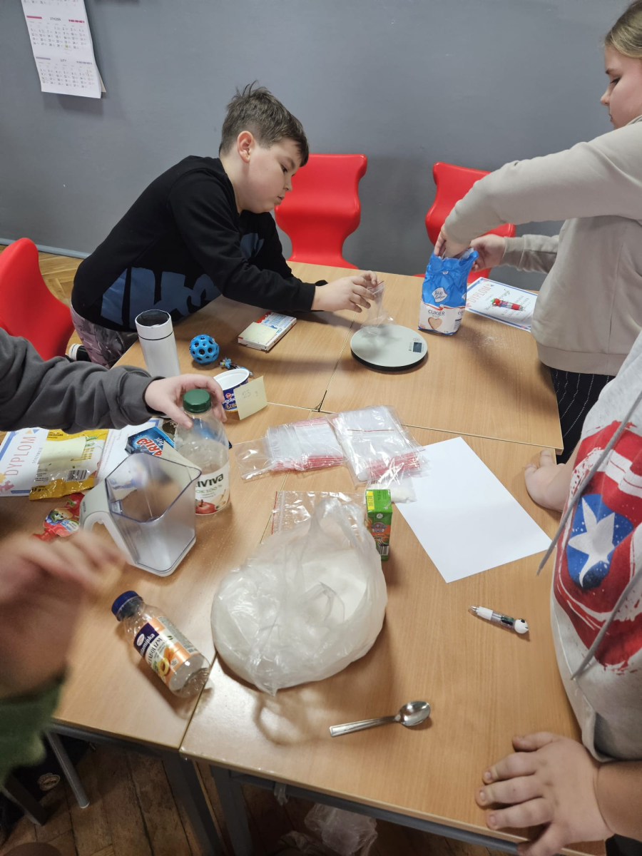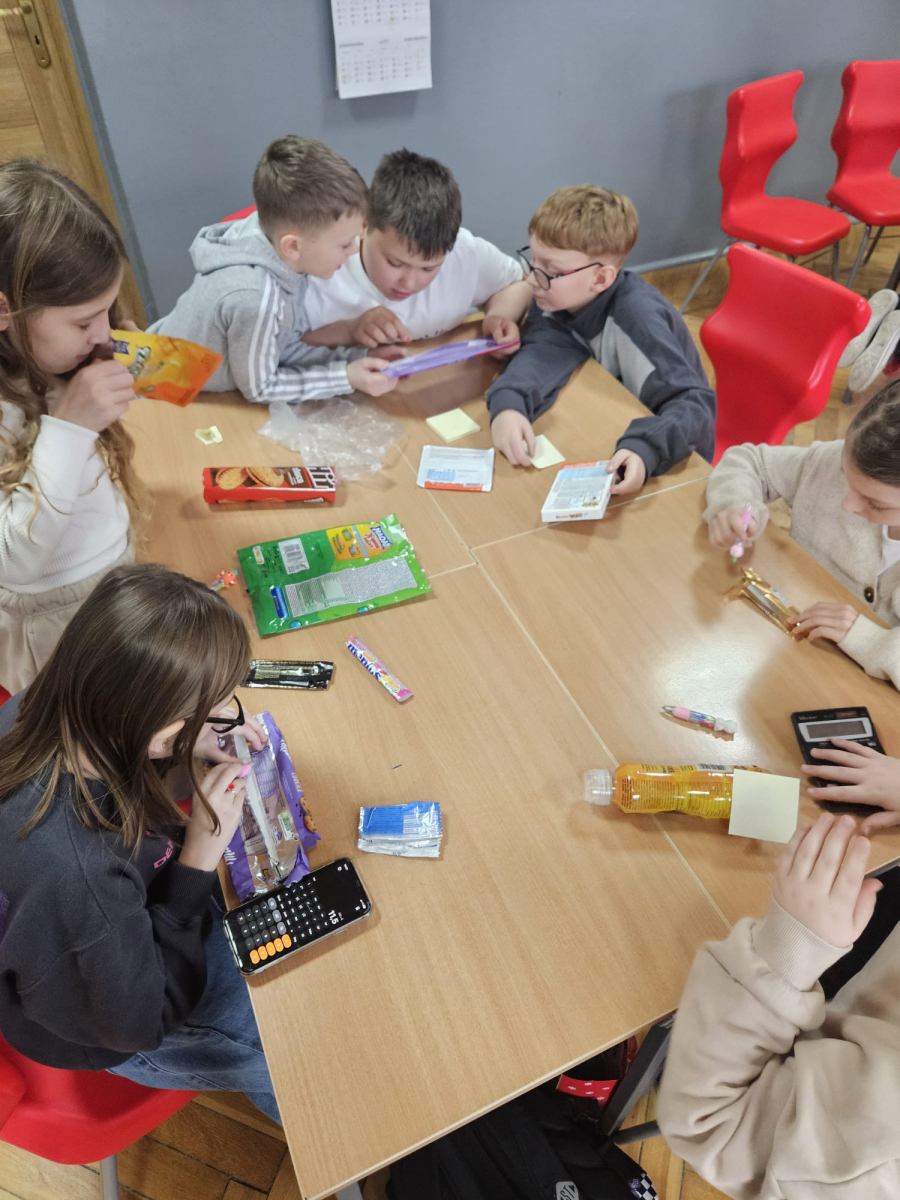 MODUŁ IV - 6. WIEM, CO JEM. Uczniowie klasy IV i VIII przygotowali tablicę przedstawiającą zawartość cukru w spożywanych przez dzieci przekąskach i napojach.