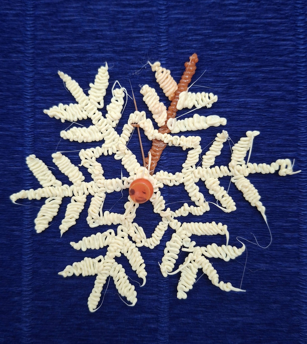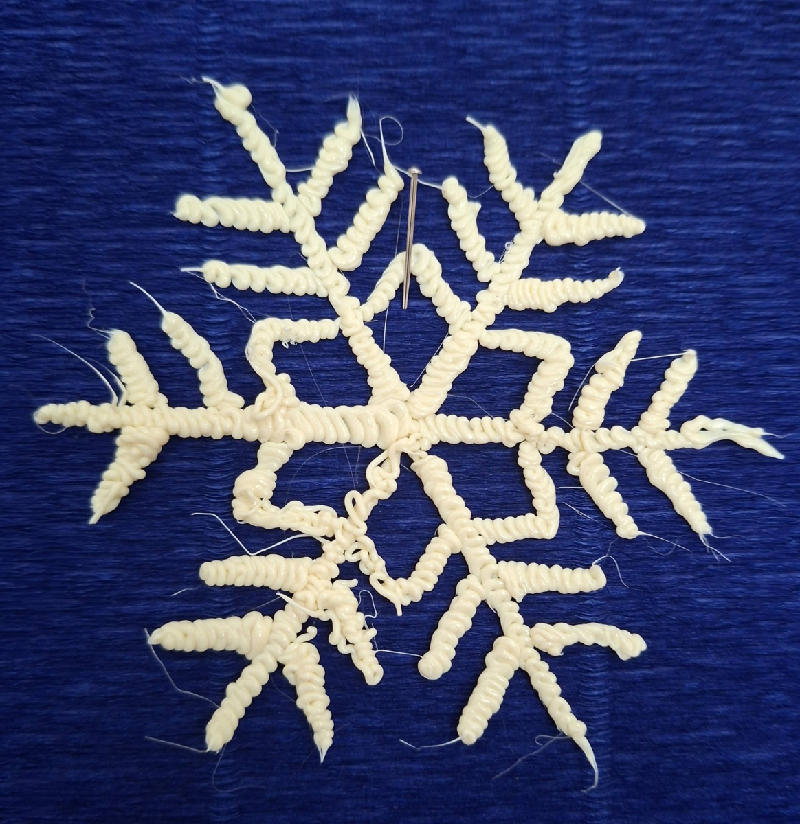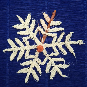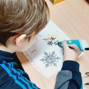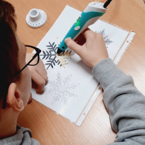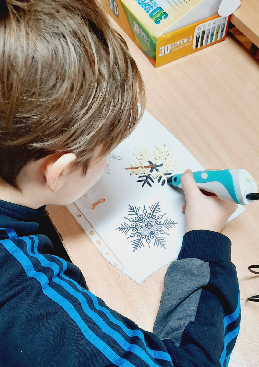 Moduł VI, zadanie 6: "SYMETRIA PŁATKÓW ŚNIEGU". Uczniowie klasy VI za pomocą pisaków 3D tworzyli symetryczne płatki śniegu.